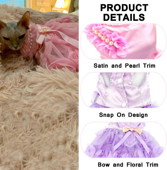 Pet Small Dog Wedding Dress with Bowknot Birthday Party Costume Satin Rose Pearls Girl Formal Dress Cat Tutu Pink, Small